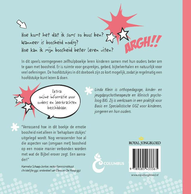 In dit speels vormgegeven praat- en doeboekje leren kinderen samen met hun ouders beter om te gaan met boosheid. Het kind ontdekt waar boosheid vandaan komt en wanneer boosheid nodig is. Ook ontdekt hij dat verschillende manieren van boos worden bij je kunnen horen: van inslikken tot woedend zijn. Hij leert hoe je ervoor kunt zorgen dat jij én anderen minder last hebben van boze buien. Er is ruimte voor gesprekjes, gebed, Bijbelverhalen en oefeningen. De hoofdstukjes in dit doeboek zijn zo kort mogelijk, zodat je regelmatig een hoofdstukje kunt lezen, invullen en de oefeningen echt kunt gaan doen.