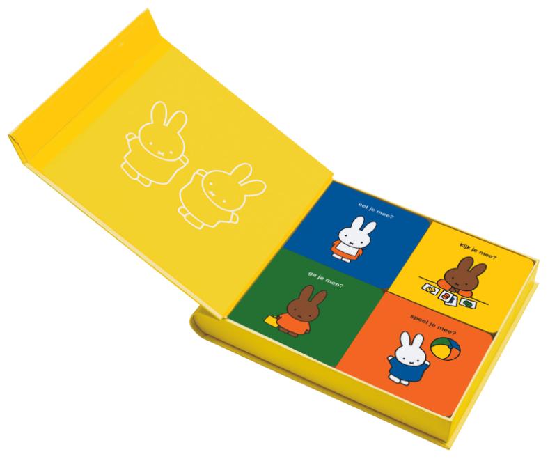 Eerste woordjes leren met nijntje en nina. In de vier vrolijke kartonboekjes staan heel veel illustraties van eten en drinken, spelen, dieren en vervoersmiddelen. Er is van alles te zien: nijntje eet taart en speelt met een bal, nina ziet een vis en gaat op reis. Kijk naar de plaatjes, wijs maar aan en lees mee!De vier boekjes zitten verpakt in een stevige bewaardoos met magnetische sluiting. Een kleurrijk cadeau voor een verjaardag en voor de feestdagen.