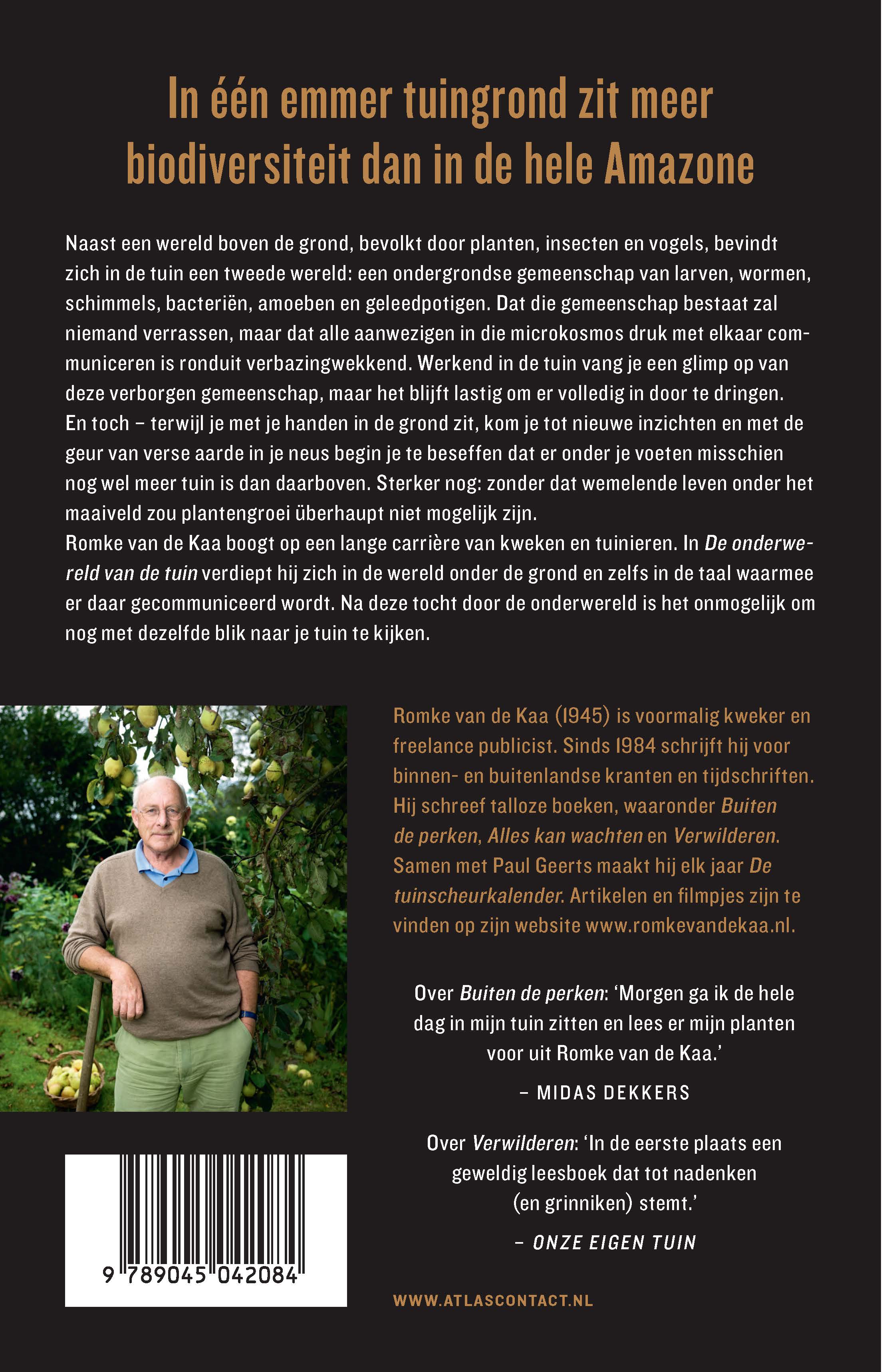 In ‘De onderwereld van de tuin’ verdiept Romke van de Kaa zich in de ondergrondse gemeenschap van larven, wormen, schimmels, bacteriën, amoeben en geleedpotigen. Dat die gemeenschap bestaat zal niemand verrassen, maar dat alle aanwezigen in die microkosmos druk met elkaar communiceren is ronduit verbazingwekkend. Werkend in de tuin vang je een glimp op van deze verborgen gemeenschap, maar het blijft lastig om er volledig in door te dringen. En toch – terwijl je met je handen in de grond zit, kom je tot nieuwe inzichten en met de geur van verse aarde in je neus begin je te beseffen dat er onder je voeten misschien nog wel meer tuin is dan daarboven. Sterker nog: zonder dat wemelende leven onder het maaiveld zou plantengroei überhaupt niet mogelijk zijn.