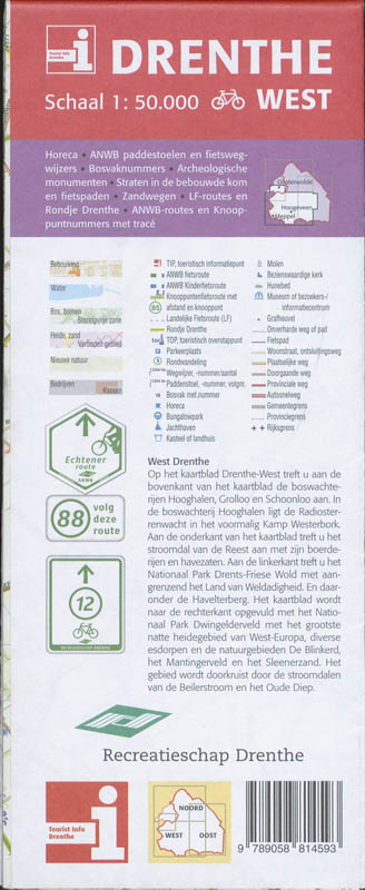 Schaal 1:50.000. Fietsroutenetwerk met knooppunten, wegwijzernummers en straatnamen.