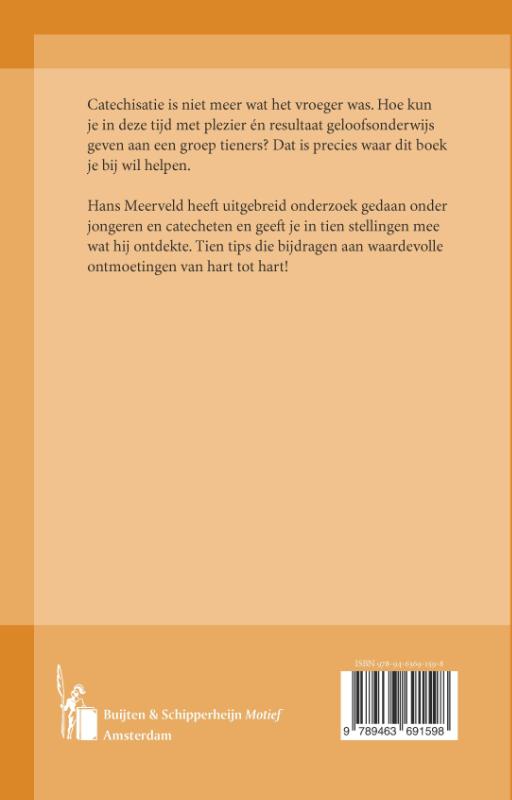 Catechisatie is niet meer wat het vroeger was. Hoe kun je in deze tijd met plezier én resultaat geloofsonderwijs geven aan een groep tieners? Dat is precies waar dit boe je bij wil helpen.Hans Meerveld heeft uitgebreid onderzoek gedaan onder jongeren en catecheten geeft je in tien stellingen mee wat hij ontdekte. Tien tips die bijdragen aan waardevolle ontmoetingen van hart tot hart.Kort na zijn promotie overleed Hans Meerveld. Dit boekje had hij toen in concept klaar. Zijn collega Ingrid Plantinga heeft de tekst verder gereed gemaakt voor publicatie.