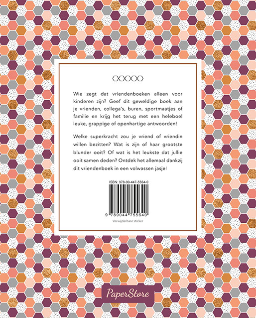 Wie zegt dat vriendenboeken alleen voor kinderen zijn? Geef dit geweldige boek aan je vrienden, collega’s, buren, sportmaatjes of familieleden en krijg het terug met een heleboel verrassende, openhartige en vaak ook grappige antwoorden. Welke superkracht zou je vriend of vriendin willen bezitten? Wat is zijn of haar grootste blunder ooit? Of wat is het leukste dat jullie ooit samen deden? Ontdek het allemaal dankzij dit vriendenboek in een volwassen jasje! Gebonden uitvoering met leeslint.