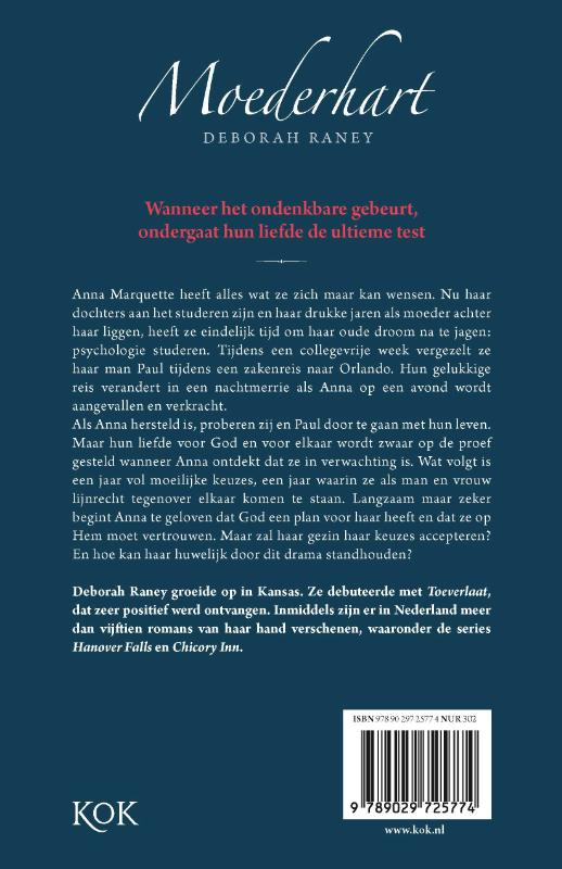 In ‘Moederhart’van Deborah Raney heeft Anna Marquette eindelijk de tijd om haar oude droom na te jagen en psychologie te studeren, nu haar dochters aan het studeren zijn en haar drukke jaren als moeder achter haar liggen. Tijdens een collegevrije week vergezelt ze haar man Paul tijdens een zakenreis naar Orlando. Hun gelukkige reis verandert in een nachtmerrie als Anna wordt aangevallen.Als ze hersteld is, proberen Anna en Paul zo snel mogelijk te vergeten wat haar is overkomen, maar hun liefde voor God en voor elkaar wordt zwaar op de proef gesteld: Anna blijkt zwanger. Deborah Raney schuwt zware thema’s niet in haar romans, maar weet als geen ander hoop te brengen. In Nederland zijn al meer dan 20 romans van haar hand verschenen, waaronder de familieserie ‘De Chicory Inn’.