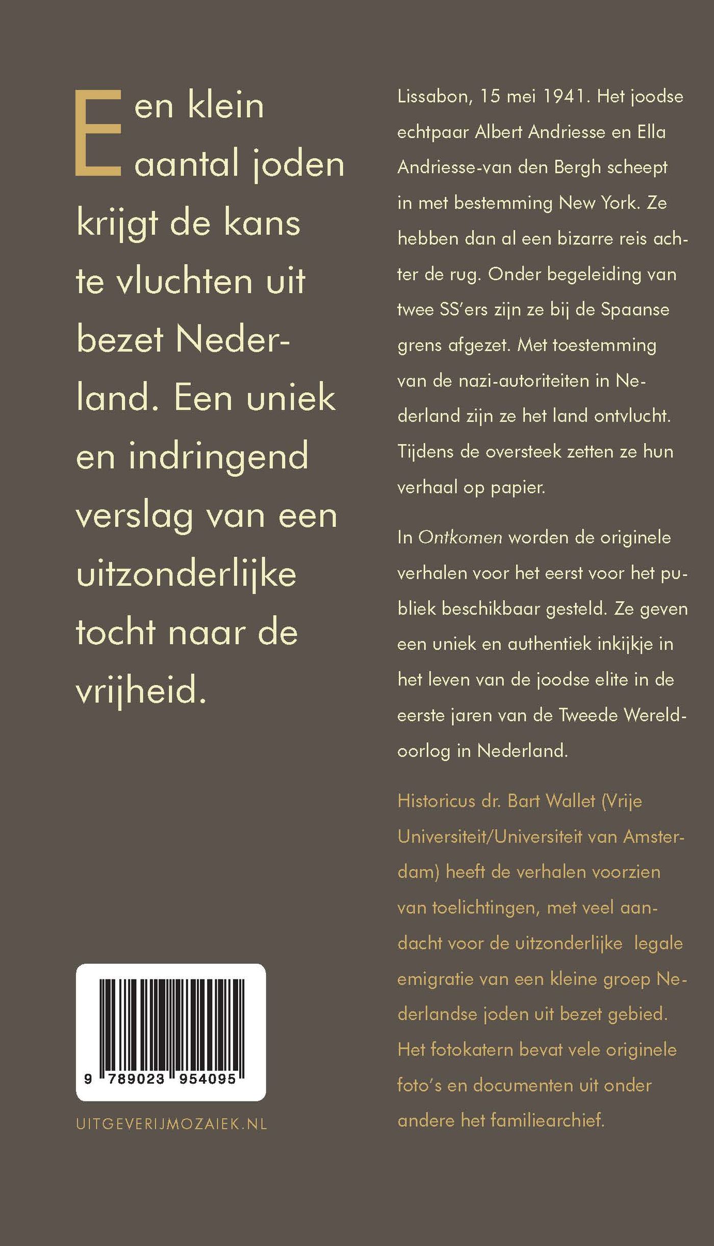 ‘Ontkomen’ is het vluchtverhaal van het joodse echtpaar Albert en Ella Andriesse-van den Bergh uit 1940-1941, bezorgd door historicus dr. Bart Wallet. Deze authentieke documenten – decennialang alleen in familiekring bekend – geven een uniek inkijkje in het leven van de Nederlands-joodse elite in de eerste jaren van de Tweede Wereldoorlog. De tekst is voorzien van een inleiding en toelichtende teksten, met veel aandacht voor de uitzonderlijke legale emigratie van een kleine groep Nederlandse joden uit bezet gebied. Het fotokatern bevat vele originele foto’s en documenten uit onder andere het familiearchief.
