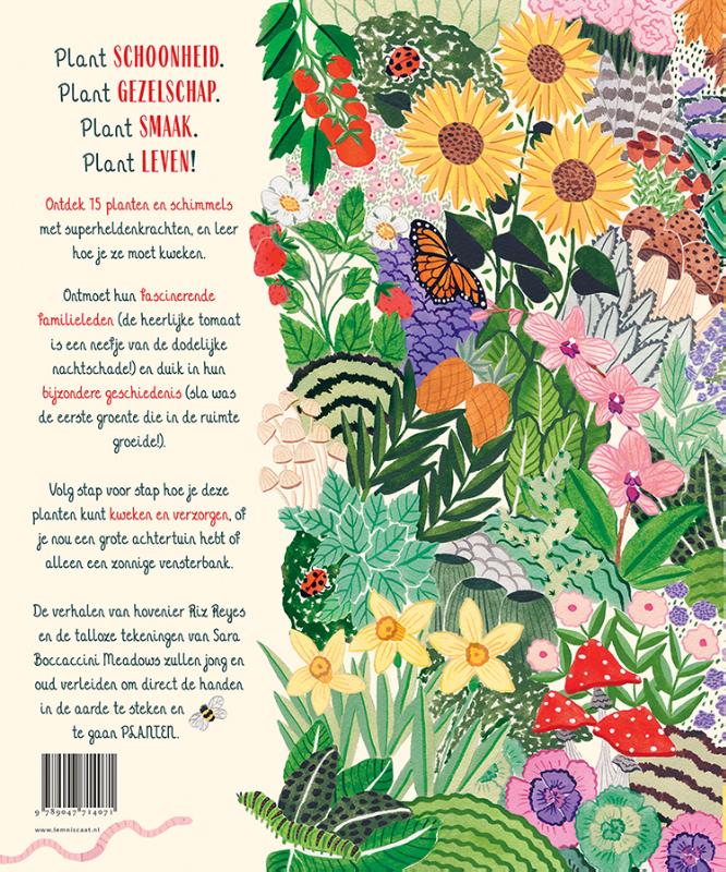Het allermooiste plantenboek om meteen mee aan de slag te gaanOntdek vijftien planten en schimmels met superheldenkrachten en leer hoe je ze moet kweken.Ontmoet hun fascinerende familieleden (de heerlijke tomaat is een neefje van de dodelijke nachtschade!) en duik in hun bijzondere geschiedenis (sla was de eerste groente die in de ruimte groeide).Volg stap voor stap hoe je deze planten kunt kweken en verzorgen, of je nou een grote achtertuin hebt of alleen een zonnige vensterbank.De verhalen van hovenier Riz Reyes en de talloze tekeningen van Sara Boccaccini Meadows zullen jong en oud verleiden omdirect de handen in de aarde te steken en te gaan PLANTEN.