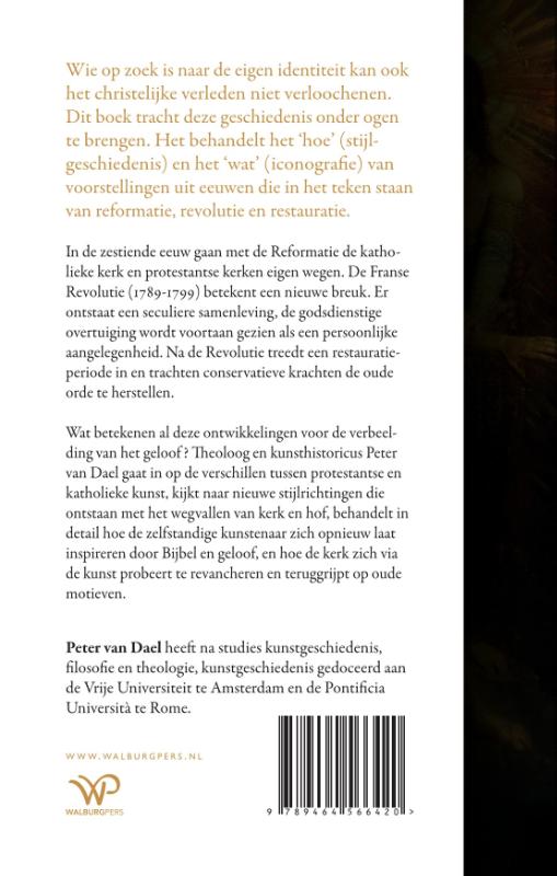 Wie op zoek is naar de eigen identiteit kan ook het christelijke verleden niet verloochenen. Dit boek tracht deze geschiedenis onder ogen te brengen. Het behandelt het ‘hoe’ (stijlgeschiedenis) en het ‘wat’ (iconografie) van voorstellingen uit eeuwen die in het teken staan van reformatie, revolutie en restauratie. In de zestiende eeuw gaan met de Reformatie de katholieke kerk en protestantse kerken eigen wegen. De Franse Revolutie (1789-1799) betekent een nieuwe breuk. Er ontstaat een seculiere samenleving, de godsdienstige overtuiging wordt voortaan gezien als een persoonlijke aangelegenheid. Na de Revolutie treedt een restauratie- periode in en trachten conservatieve krachten de oude orde te herstellen.Wat betekenen al deze ontwikkelingen voor de verbeelding van het geloof ? Theoloog en kunsthistoricus Peter van Dael gaat in op de verschillen tussen protestantse en katholieke kunst, kijkt naar nieuwe stijlrichtingen die ontstaan met het wegvallen van kerk en hof, behandelt in detail hoe de zelfstandige kunstenaar zich opnieuw laat inspireren door Bijbel en geloof, en hoe de kerk zich via de kunst probeert te revancheren en teruggrijpt op oude motieven.