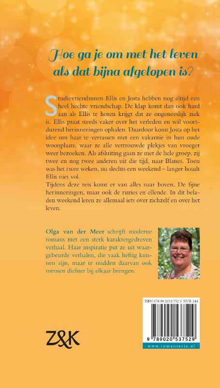 De ernstig zieke Ellis heeft in ‘Reis naar toen’ van Olga van der Meer niet lang meer te leven. Haar beste vriendin Josta besluit haar te verrassen met een lang weekend naar Blanes, samen met hun vriendengroep van vroeger. Tijdens deze vakantie komt er van alles naar boven. De fijne herinneringen, maar ook de ruzies en ellende. Een voor een ontdekken ze tijdens die beladen vakantie wat er écht toe doet in het leven.