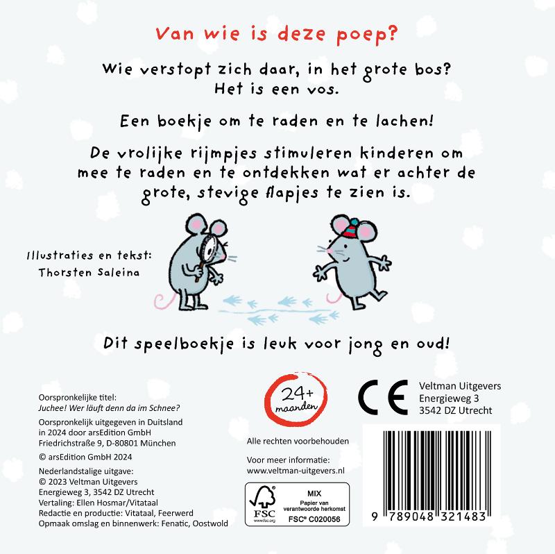Van welk dier is dit spoor hier?Wie verstopt zich daar, in het grote bos?Het is een vos.Een boekje om te raden en te lachen! De vrolijke rijmpjes stimuleren kinderen om mee te raden en te ontdekken wat er achter de grote, stevige flapjes te zien is.Dit speelboekje is leuk voor jong en oud!