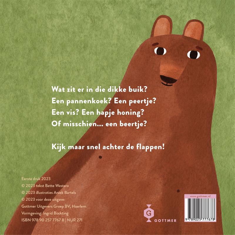 ‘Wat zit er in die dikke buik?’ is een kartonboek met flappen, perfect voor elk kind vanaf 18 maanden dat benieuwd is waar baby’s vandaan komen en elk toekomstig groot broertje of zusje. Op haar eigenwijze, speelse toon en in toegankelijk peuterrijm laat auteur Bette Westera kinderen raden wat er verstopt zit in de dikke buiken van allerlei dieren. Op elke pagina staat een ander dier met een opvallend dikke buik, wat zou daarin kunnen zitten? Heeft de kat een muis gevangen of een slagroomsoes gestolen? En heeft de beer honing en fruit gesnoept? En wat zou er in mama’s buik zitten? Op elke pagina bevindt zich een flapje met het antwoord: schattige babypoesjes, een kleine beer, en… een baby!